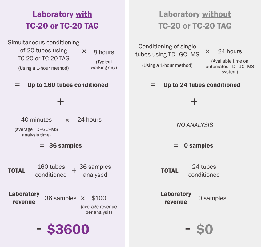 The TC-20™ and TC-20 TAG™ are compact, stand-alone devices for the simultaneous conditioning or dry-purging of up to 20 thermal desorption sorbent tubes.